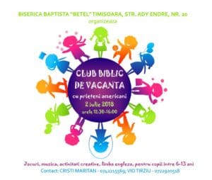 Biserica Baptistă Betel din Timișoara organizează sâmbătă, 2 iulie între orele 12:30 și 16:00, Club Biblic de vacanță pentru copii.