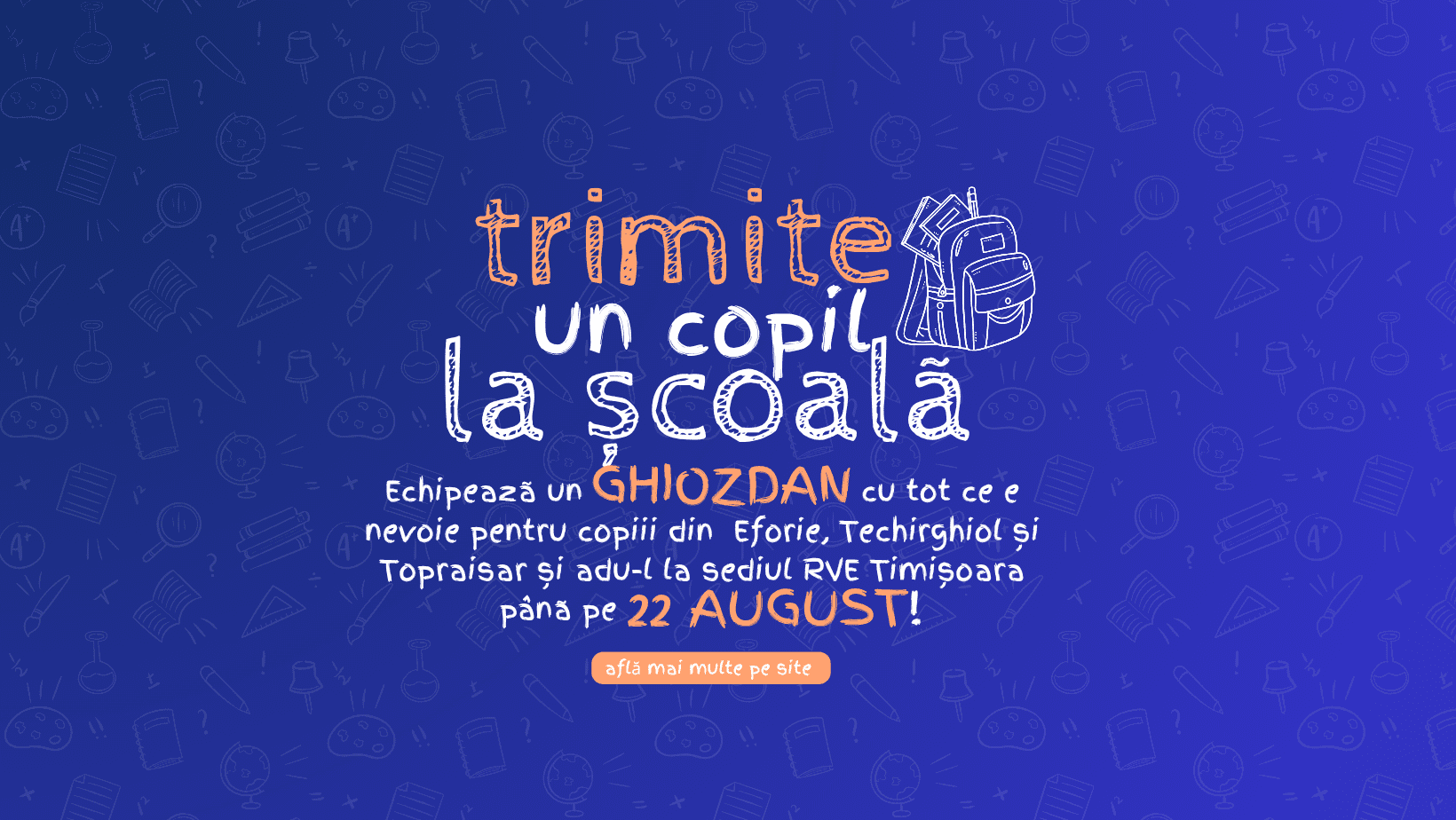 Dacă nu poți ajunge fizic cu un ghiozdan, poți sprijini proiectul donând online, în contul nostru https://www.rve-timisoara.ro/doneaza/. Te rugăm să menționezi „Proiect ghiozdane” la detaliile donației.