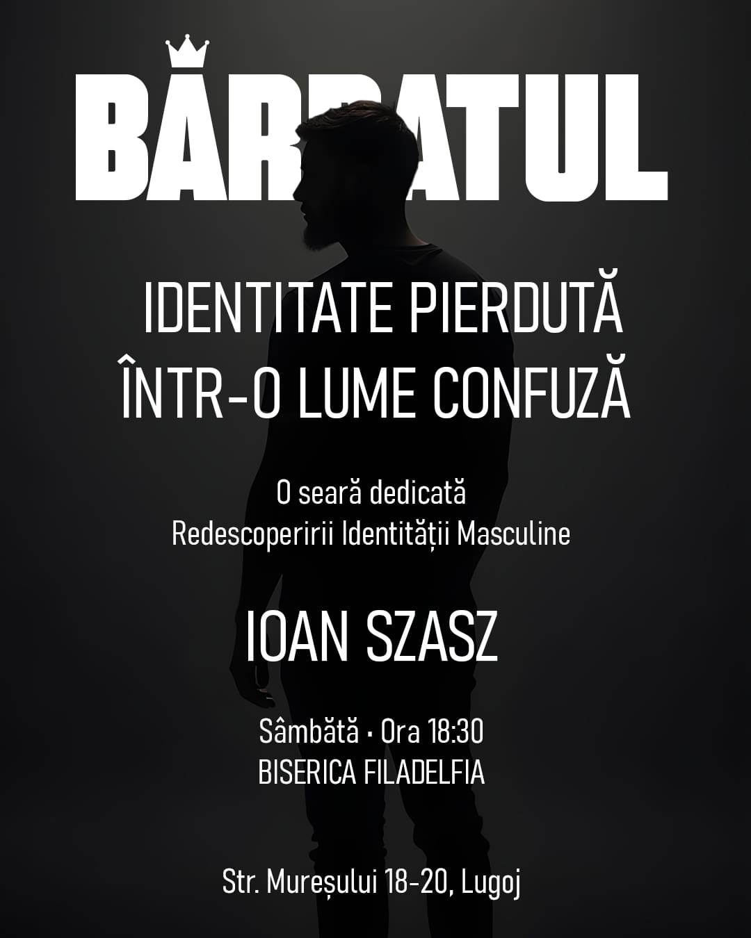 Biserica Filadelfia din Lugoj organizează sâmbătă, 17 mai, de la ora 18:30, un eveniment special intitulat „Bărbatul – identitate pierdută într-o lume confuză”. Invitatul serii este pastorul Ioan Szasz, care va vorbi despre provocările identității masculine în societatea contemporană.