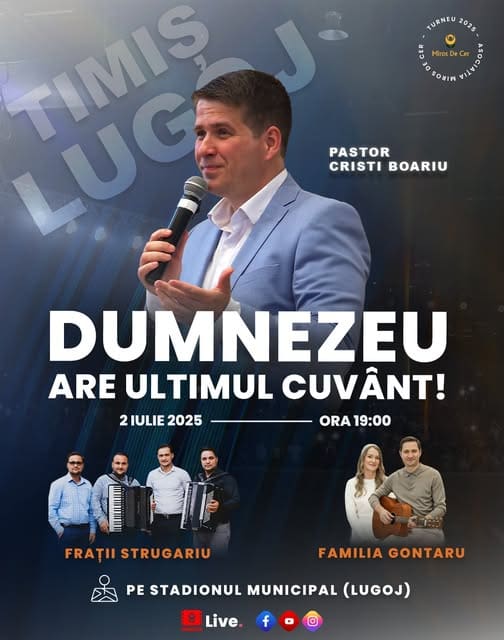 Biserica Filadelfia din Lugoj și Asociația Miros de Cer organizează în data de 2 iulie, o seară de evanghelizare în aer liber. Evenimentul face parte din turneul „Miros de Cer” 2025 și are loc pe Stadionul Municipal din Lugoj, începând cu ora 19:00.